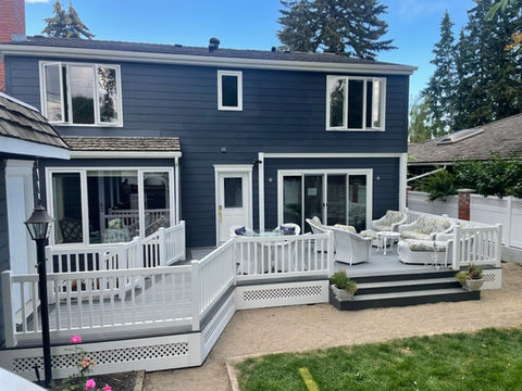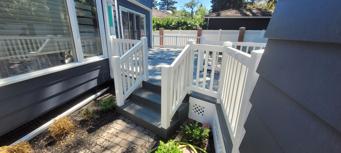 A vinyl railing system encloses the entire deck providing a clean edge and safety.